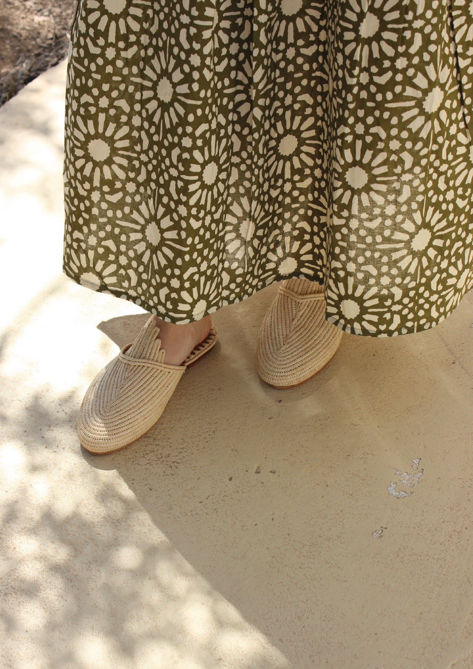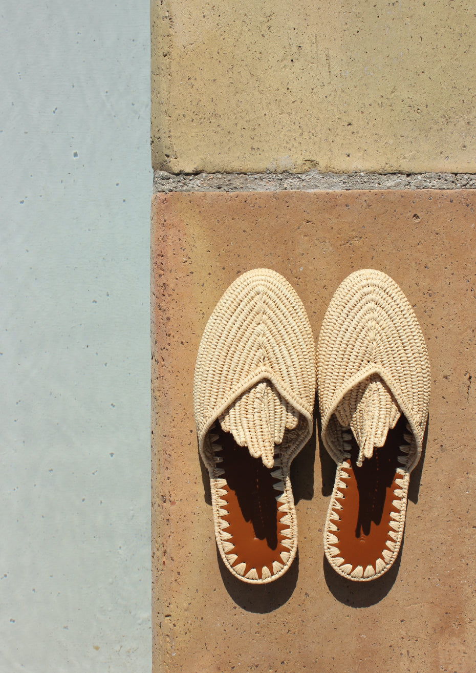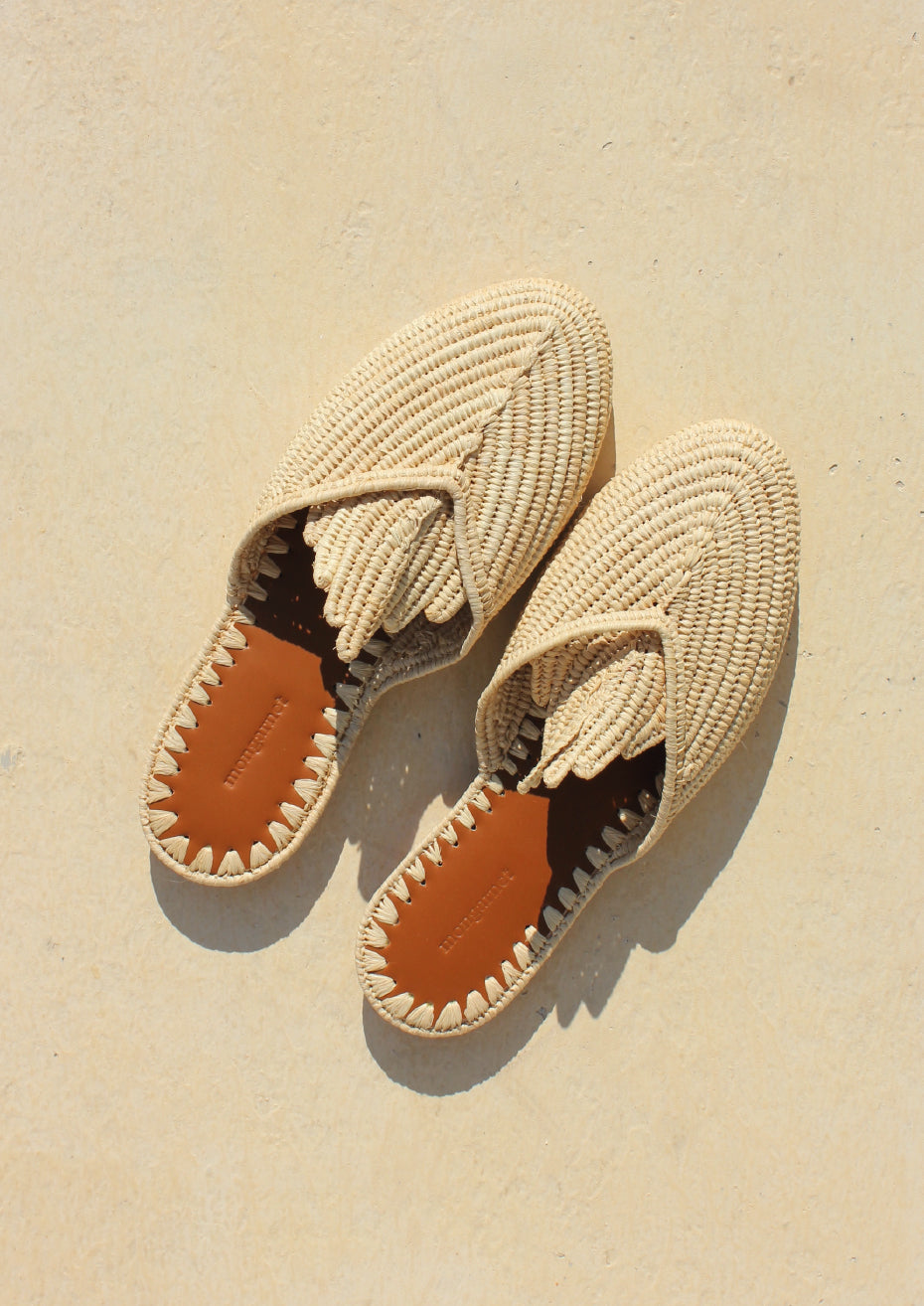 Los materiales que utilizamos para elaborar nuestros zapatos son Rafia natural procedente de palmeras de Essaouira y cuero para la suela.